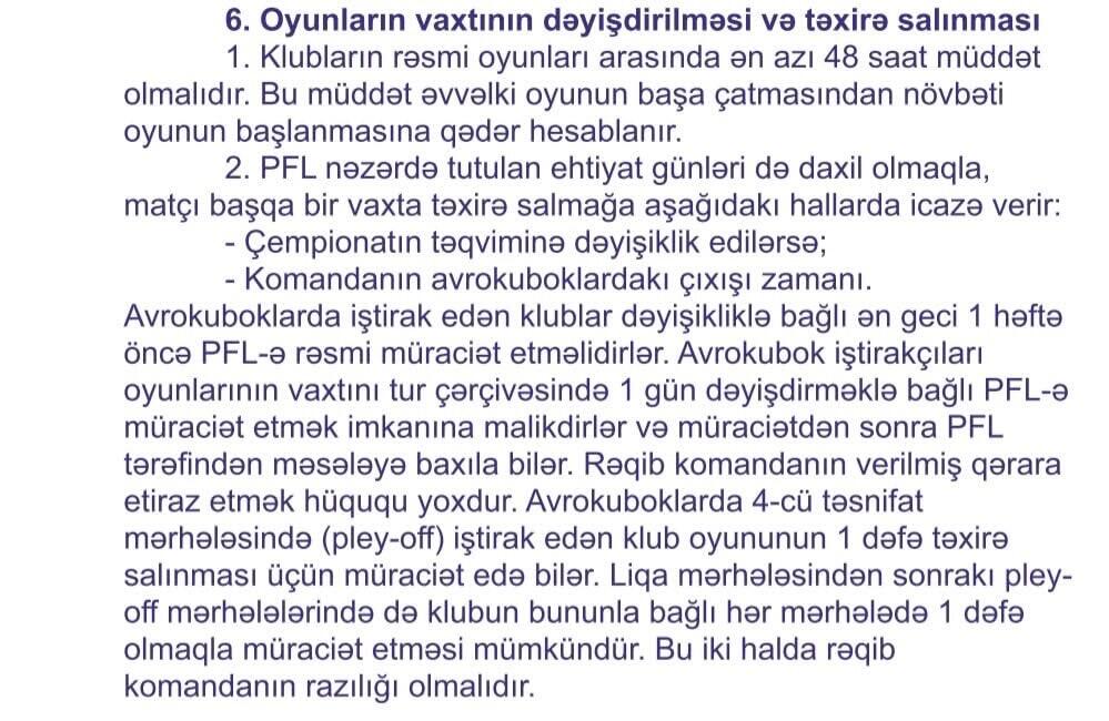Həmçinin, PFL-in əsasnaməsində də matçların təxirə salınması ilə bağlı maddələrin olması qabardılır. Amma PFL-in əsasnaməsində bu məsələ ilə bağlı müəyyən bəndlər yer alıb.