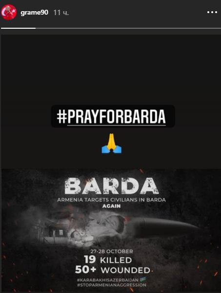 O, üzərində "Pray for Barda" ("Bərdə şəhəri üçün dua edin") sözləri yazılmış foto paylaşıb. Eyni zamanda sosial şəbəkədə Qarabağa aid video yayımlayıb və "Qarabağ Azərbaycandır" yazıb.