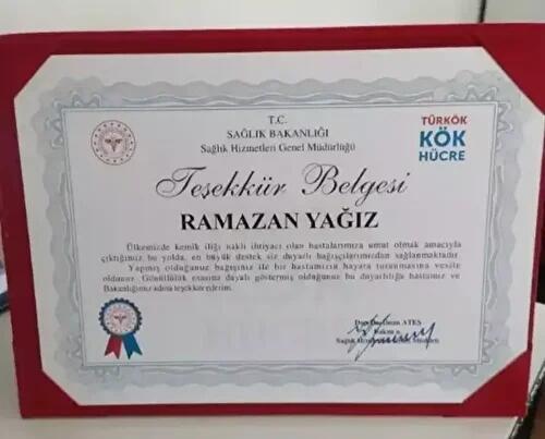 Gürcüstan-Azərbaycan sərhədində qəzaya uğrayan C-130 tipli hərbi təyyarədə şəhid olan Hava Qüvvələri Astsubay Başçavuş Ramazan Yağızın iki il əvvəl kök hüceyrə (sümük iliyi) donoru olaraq bir xərçəng xəstəsinin həyatını xilas etdiyi ortaya çıxıb.