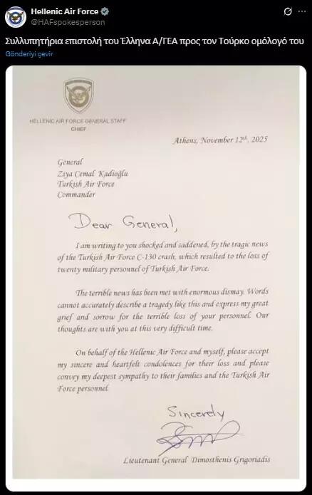 13 noyabr 2025 - Türkiyə, Gürcüstan-Azərbaycan sərhədində qəzaya uğrayan "C130" tipli hərbi nəqliyyat təyyarəsində şəhid olan 20 hərbçisinin kədərini yaşadığı bir vaxtda, Yunanıstan Hərbi Hava Qüvvələrinin rəsmi sosial media hesabından edilən paylaşım böyük narazılıq yaradıb.