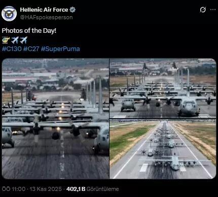 Milli.Az xəbər verir ki, Yunan Hərbi Hava Qüvvələrinin rəsmi hesabında "C130" tipli hərbi təyyarələrin fotoları paylaşılaraq, onların altına "Günün fotosu" qeydi əlavə edilib.