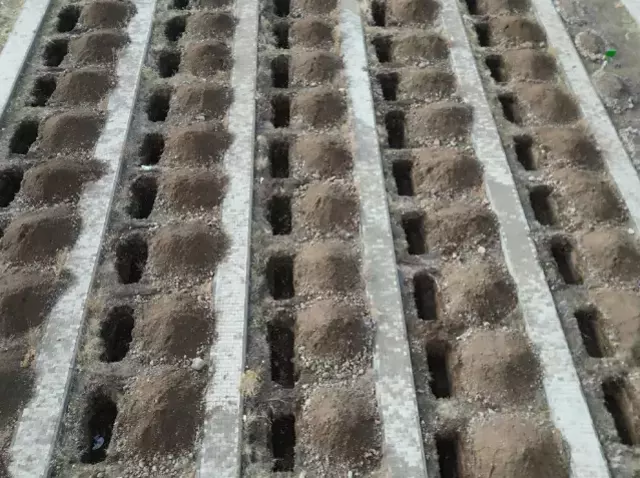 Məzarlar əvvəlcə ağır texnika ilə qazılır, sonra işçilər tərəfindən kürəklə formalaşdırılır.