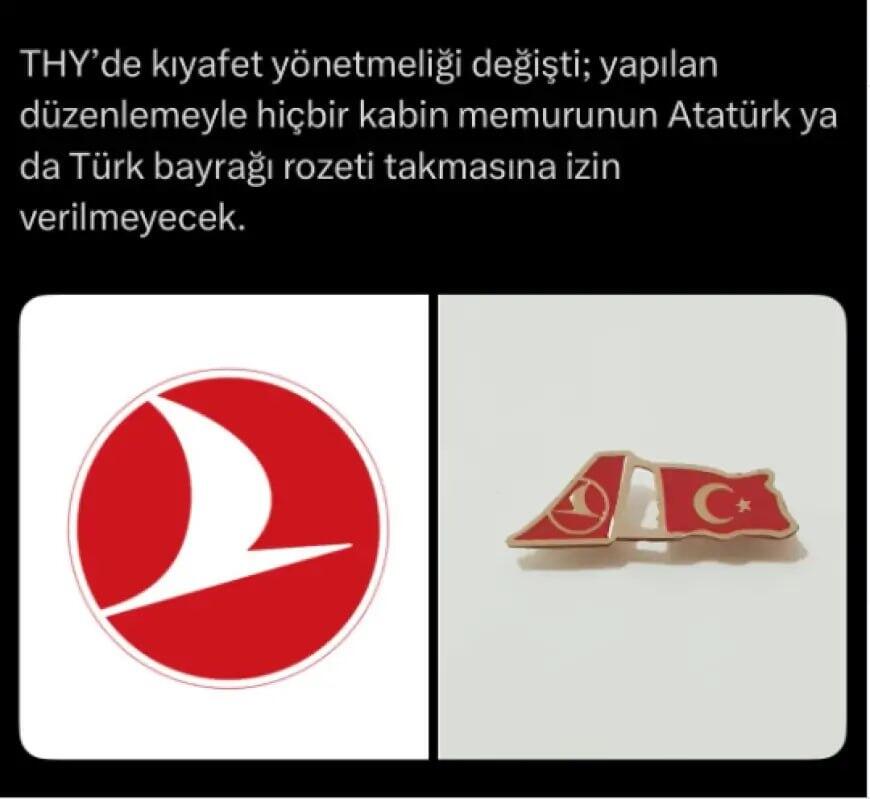 Milli.Az xəbər verir ki, yeni qaydalara əsasən, təyyarə bələdçilərinə yalnız THY-yə məxsus rəsmi böyüklük nişanını taxmağa icazə verilir. Atatürk və Türkiyə bayrağı təsvirli nişanlar da daxil olmaqla, digər bütün nişanlar qadağan olunub.