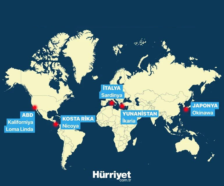 Mavi zonalar - Okinava (Yaponiya), Sardiniya (İtaliya), Nikoya yarımadası (Kosta Rika), İkariya (Yunanıstan) və Loma Linda (Kaliforniya, ABŞ) - dünyanın ən uzunömürlü insanların yaşadığı məkanlardır.