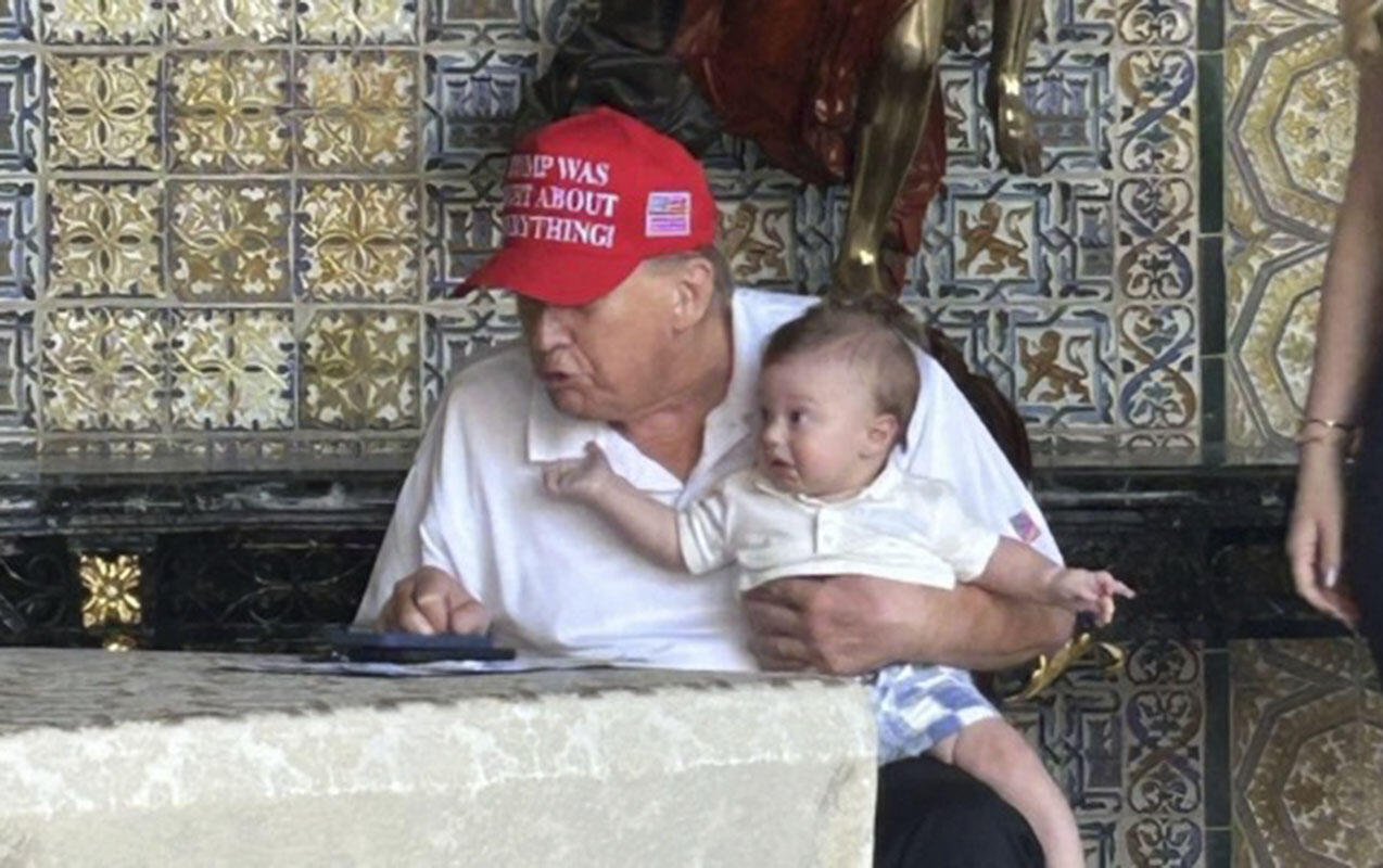 Milli.Az xəbər verir ki, şəkildə ABŞ prezidenti nəvəsini dizinin üstündə oturdub, üzərində "Tramp hər şeydə haqlı idi" şüarı yazılmış qırmızı papaq taxaraq telefonuna baxır.