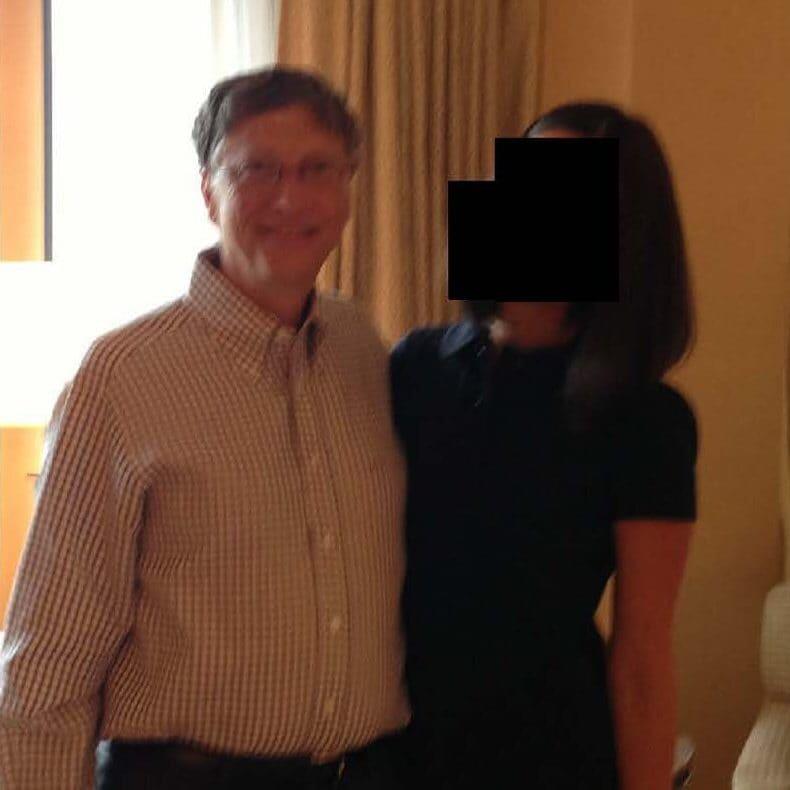Fotolardan birində Qeyts tünd saçlı və tünd göy rəngli geyimli bir qadınla qol-qola, başqa birində isə ağ köynək geyinmiş bir qadınla dəhlizdə dayanır. Hər iki halda qadınların üzləri görünmür və onların fərqli şəxslər olub-olmadığı dəqiqləşməyib.