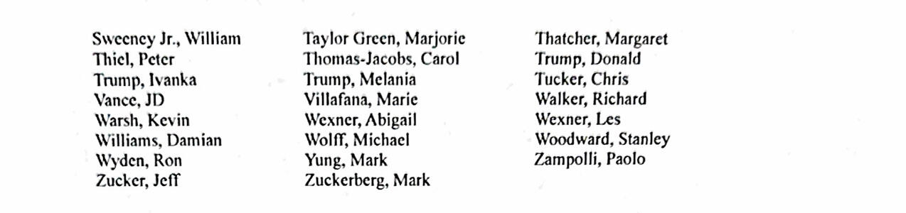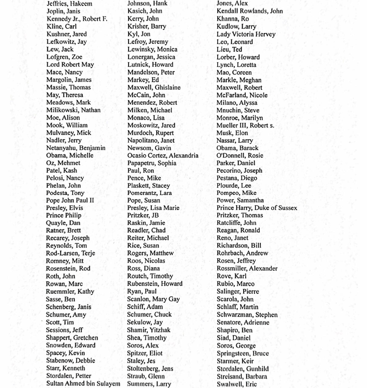 Milli.Az xəbər verir ki, "Fox News"un yaydığı məlumata əsasən, siyahıya sənədlərdə ən azı bir dəfə adı keçən keçmiş və hazırkı vəzifəli şəxslər, həmçinin siyasi baxımdan nüfuzlu fiqurlar daxil edilib. Qeyd olunur ki, adların sənədlərdə yer alması həmin şəxslərin hər hansı cinayətdə təqsirli olması anlamına gəlmir.