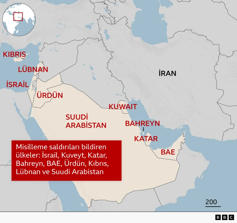 İran ilk hücumlardan sonra İsraili birbaşa hədəfə alıb və regiondakı ABŞ obyektlərinə zərbələr endirib. Hücumların yayıldığı ölkələr arasında bunlar var: