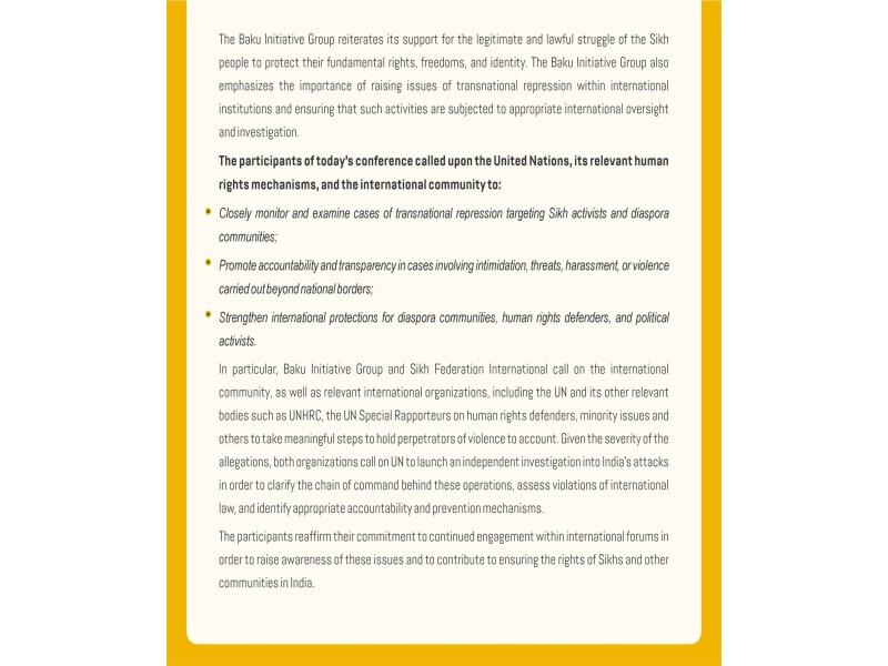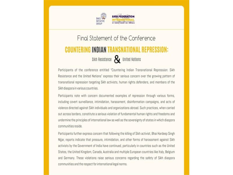 "Hindistan hökumətinin transmilli repressiyalarına qarşı mübarizə: Zixlərin müqaviməti və BMT" mövzusunda keçirilən beynəlxalq konfransın iştirakçıları müxtəlif ölkələrdə fəaliyyət göstərən zix icmasının fəallarına, insan hüquqları müdafiəçilərinə və diaspor nümayəndələrinə qarşı təzyiq halları ilə bağlı narahatlıqlarını ifadə ediblər.