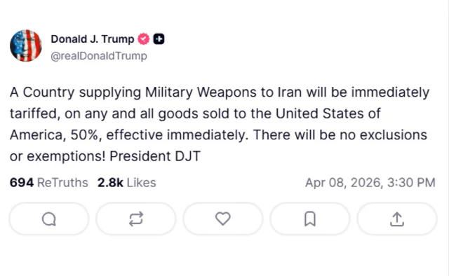 "İrana silah və hərbi vasitələr tədarükü həyata keçirən istənilən ölkənin Amerika Birləşmiş Ştatlarına ixrac etdiyi bütün məhsullara dərhal 50 faiz rüsum tətbiq olunacaq".