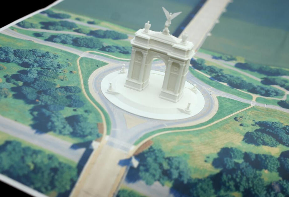 Paylaşımda əlavə edilən fotoşəkildə Harrison Design tərəfindən hazırlanmış layihə əks olunub. Dizaynda qızılı elementlərlə bəzədilmiş açıq rəngli daş tağ, yuxarı hissəsində iki böyük metal qartal və "Azadlıq" heykəlini xatırladan qızılı fiqur təsvir edilib.