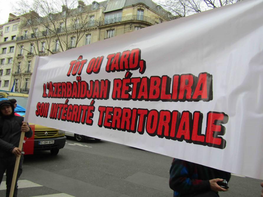 Parisdə Azərbaycan Evi tərəfindən təşkil edilmiş bu tədbir diaspora və tələbə qrupları ilə yanaşı, TEAS-ın Fransa ofisi tərəfindən də dəstək almışdır. Aksiyada Fransadakı türk diasporunun nümayəndələri də iştirak edib. Etirazçılar "Sarkisyan - müharibə cinayətkarıdır", "Erməni terrorçuları", "Ermənilər - Qarabağı tərk edin" və "Xocalıya Ədalət" kimi şüarlar səsləndiriblər. Aksiya zamanı "Qarabağ şikəstəsi" də ifa olunub.