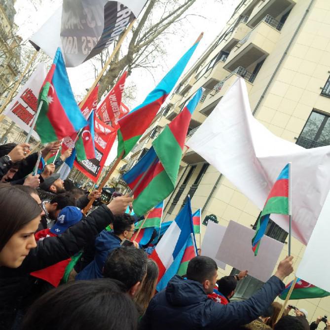 Meydana toplaşan yüzlərlə soydaşımız əllərində Azərbaycan və Fransa bayraqlarını, erməni təcavüzünü pisləyən, Azərbaycan torpaqlarının Ermənistan tərəfindən qeyri-qanunu zəbtinə dair beynəlxalq təşkilatları və ATƏT-in Minsk qrupunu bu haqsizlıqlara biganə olmamağa səsləyən transparantlar tutmuş, Qarabağın və zəbt edilmiş digər rayonların qədim Azərbaycan torpağı olduğunu, Xocalının dinc sakinlərinə qarşı ermənilərin törətdikləri vəhşilikləri pisləyən şüarlar səsləndiriblər.