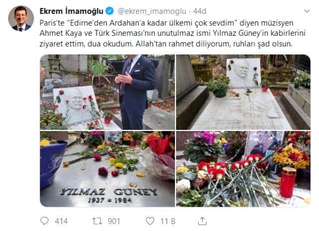 İstanbul Böyükşəhər Bələdiyyə sədri Əkrəm İmamoğlu beynəlxalq toplantı üçün getdiyi Parisdə sənətçilər Ahmet Kaya ilə Yılmaz Güneyin qəbrini ziyarət edib.